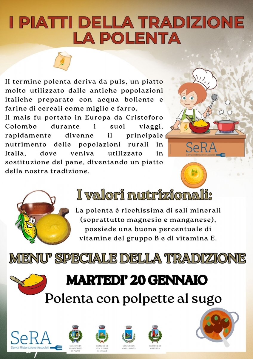 Nell'ottica di  garantire un'alimentazione sana e salutare, siamo ad informare sulla nostra iniziativa di valorizzazione dalla cultura culinaria locale attraverso i menù speciali della tradizione che saranno proposti nell'arco dell'anno.